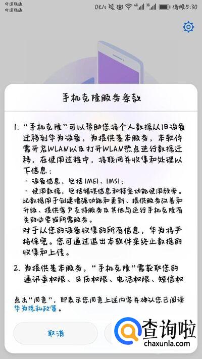 打开两部手机刚刚下载好的手机克隆,会出现下图所示页面,选择同意。