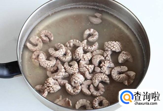 烧一锅开水,水彻底沸腾后,把腰花放进去焯烫到变色后迅速捞出过凉,浸入冰水中。