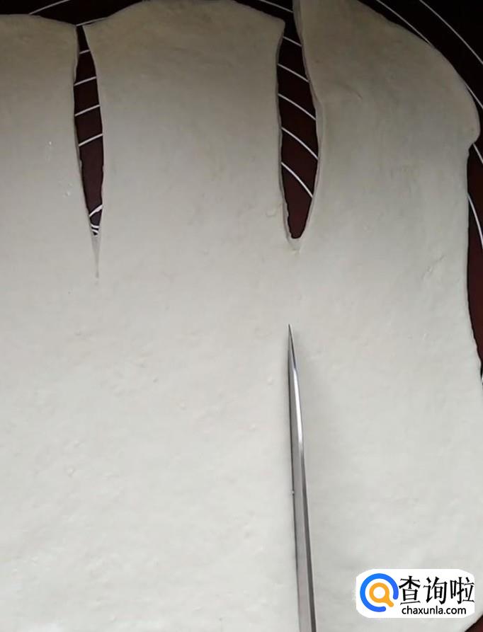 接着我们把醒发好的面擀成皮,用刀子割几个口,如图所示