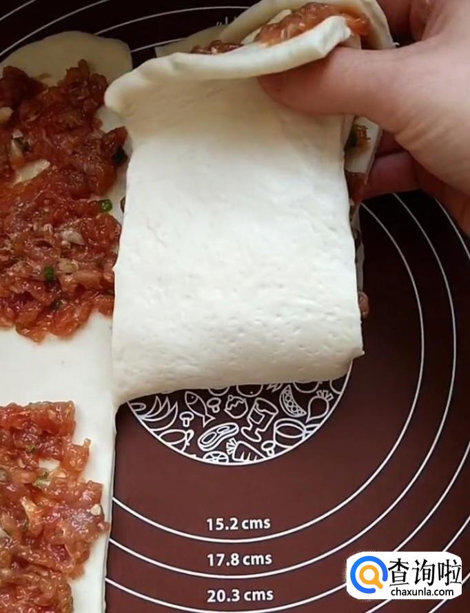 然后我们将牛肉馅放在上面,依次叠起来,用擀面杖轻轻的擀一下