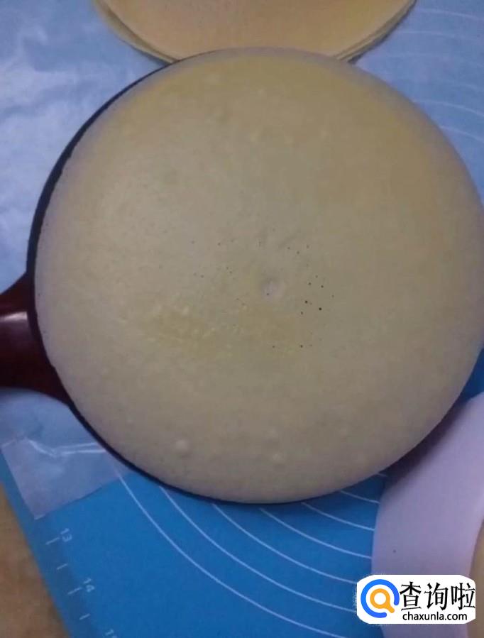 然后我们把面糊倒在薄饼机上面,薄薄的一层即可,煎至面糊起小泡取下来放在一边备用