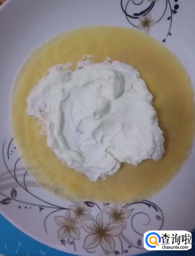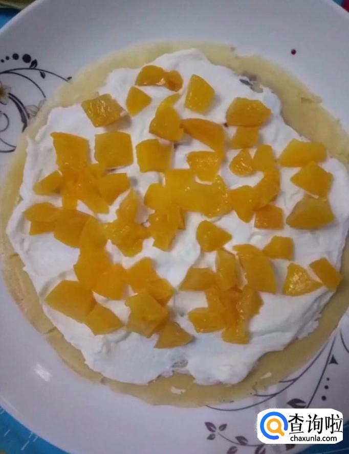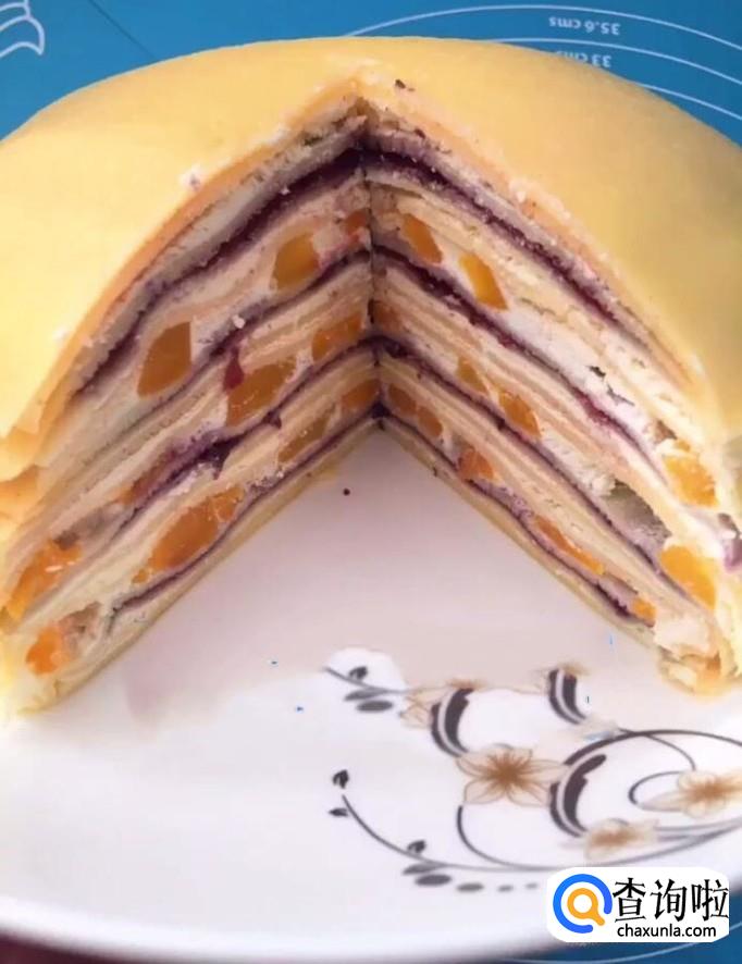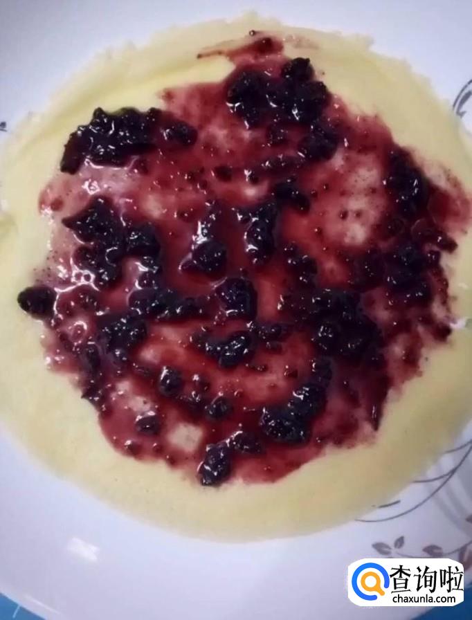 我们先在底部放上两张皮,再抹上奶油放上一层皮,倒上一些蓝莓酱,再次放上一张皮抹上奶油放上切好的芒果块,以此类推
