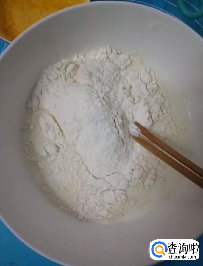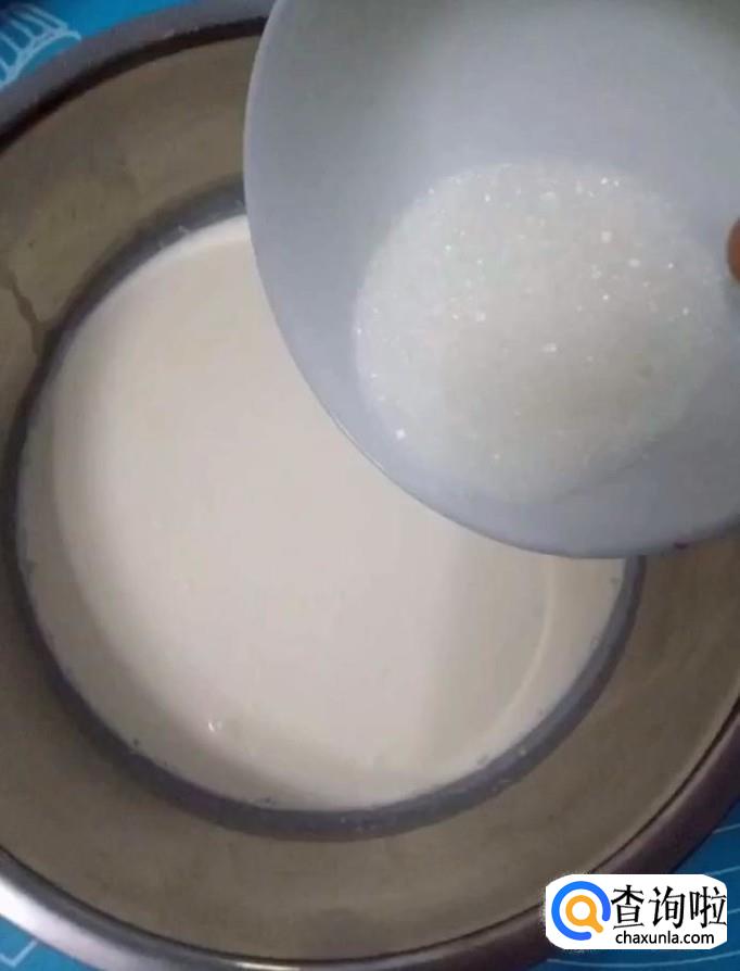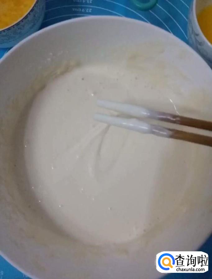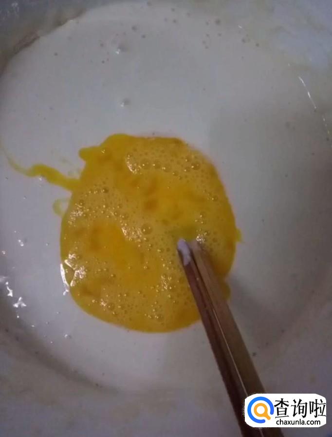 接着我们在另一个大碗中倒入适量的面粉,再倒入400g纯奶,搅拌至酸奶浓稠度的面糊备用