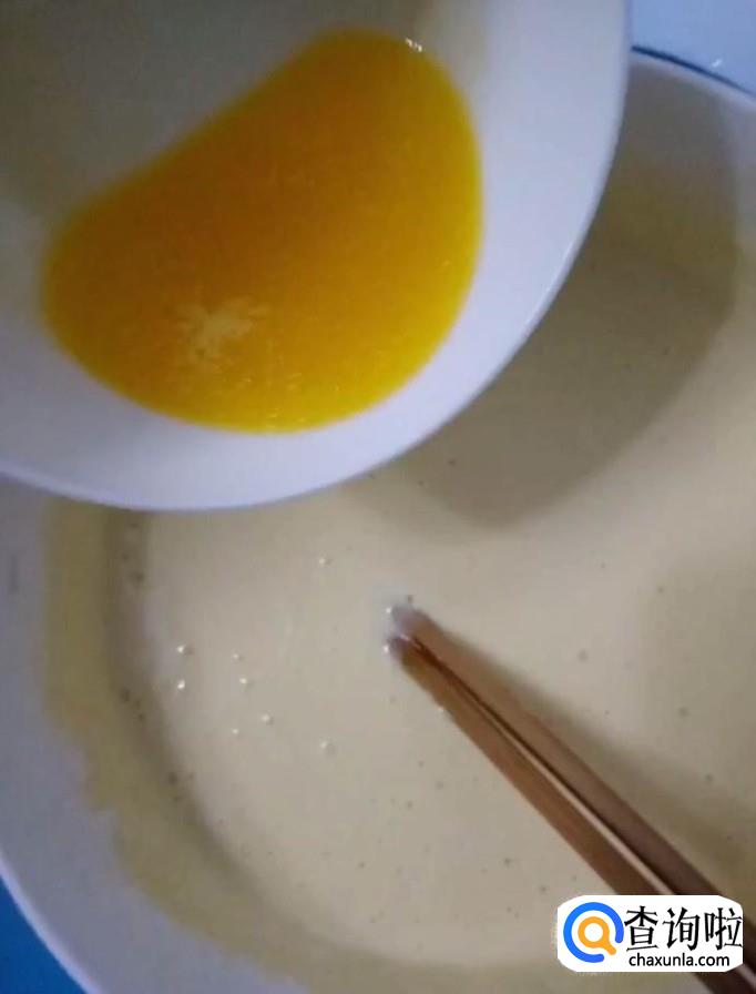 然后我们将融化好的黄油与搅拌好的鸡蛋液倒入面糊中,搅拌均匀