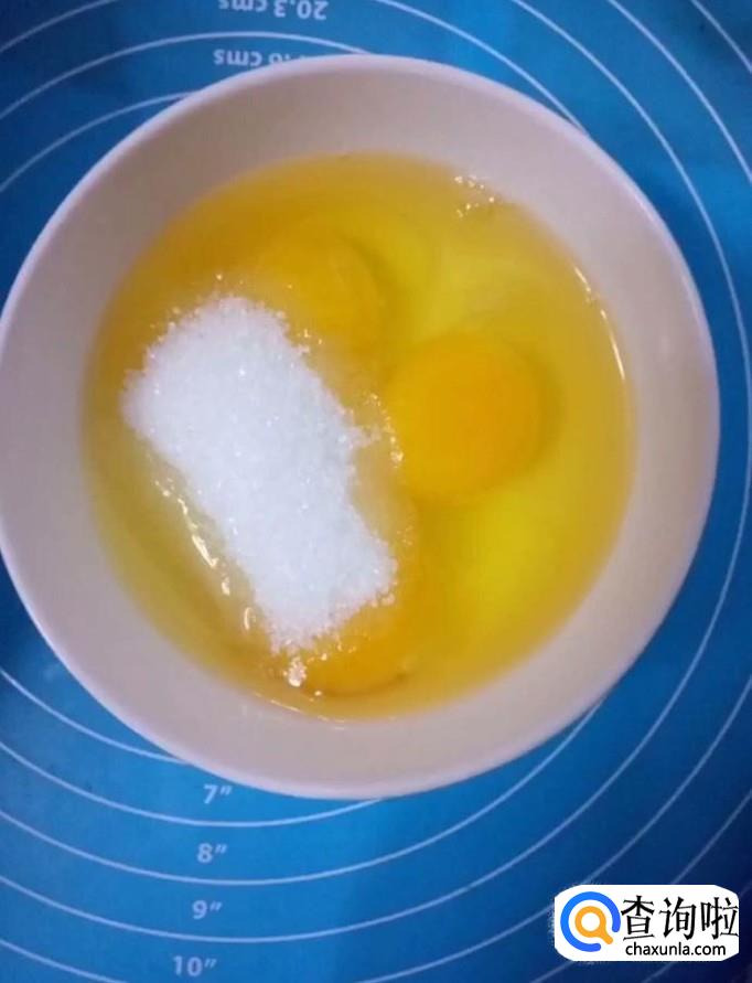 然后我们将三个鸡蛋打入碗中,再加入30g白糖,搅拌均匀