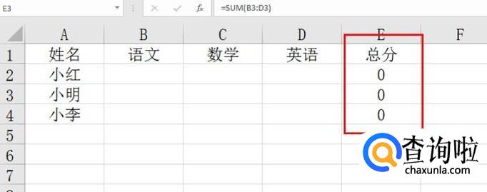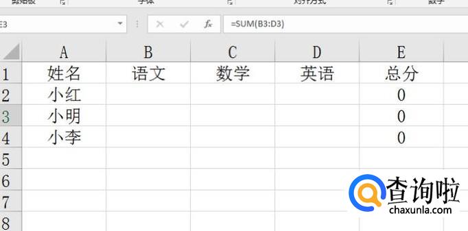 在E3单元格输入“=SUM(B3:D3)",点击回车键。