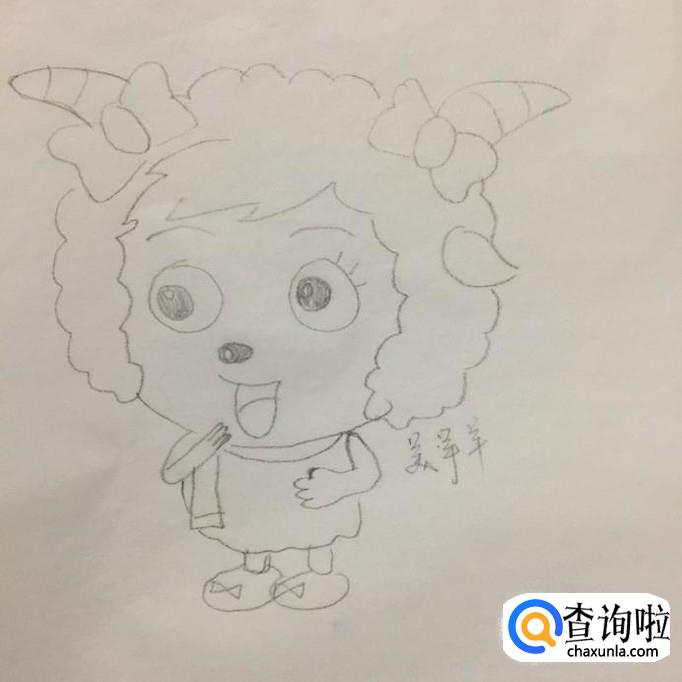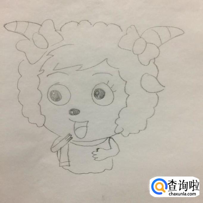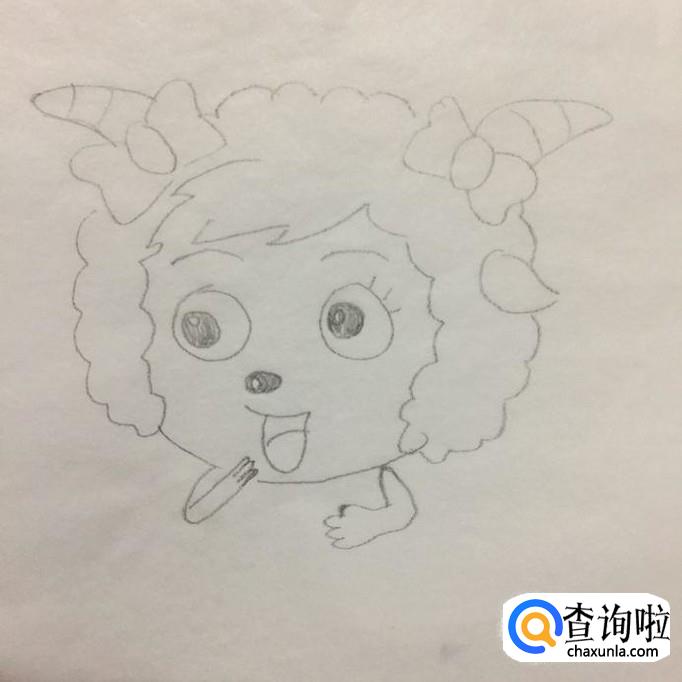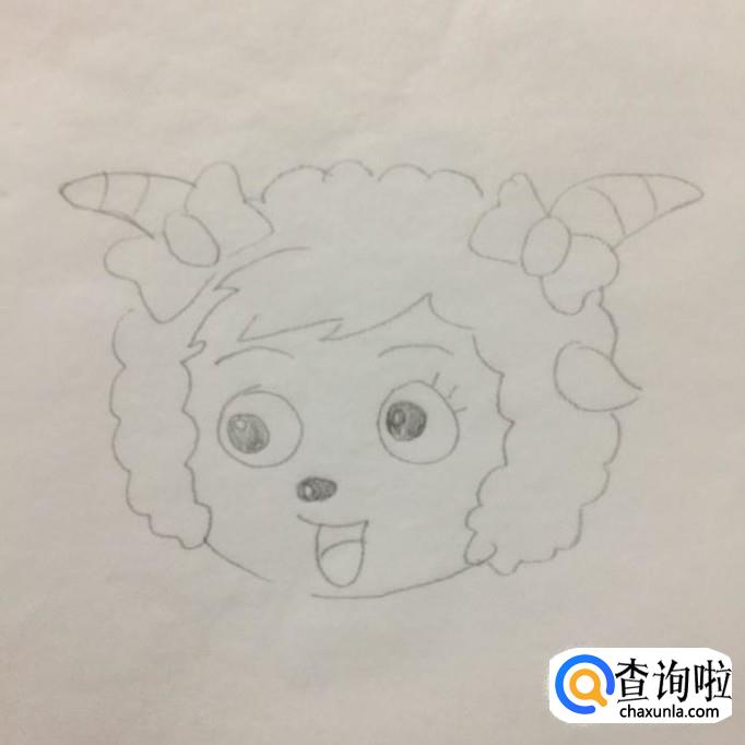 然后画出美羊羊的五官,如下图所示。我们在画美羊羊的眼睛的时候,注意要画的左右对称。