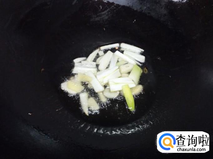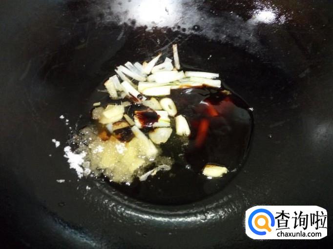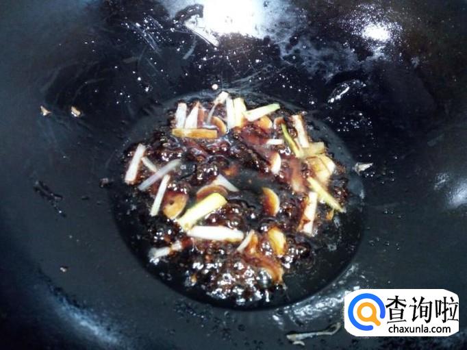 盛出煎塌鸡翅多余的油,锅内留底油。放入葱,姜,蒜爆锅,放入料酒,两匙儿蚝油,少许酱油,一匙儿白糖,翻炒成蚝油汁。