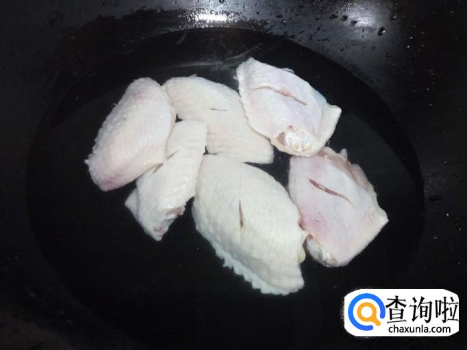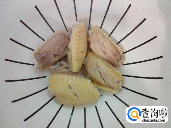 把鸡翅放入冷水锅中烧开,水开后煮一分钟的时间捞出,沥干水分。