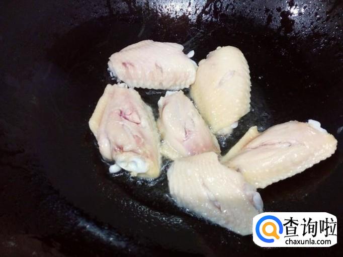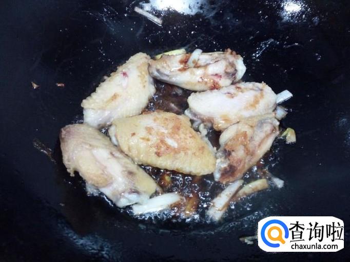 锅里放入油加热,油热后放入鸡翅小火煎塌,翻面煎塌至两面微黄,盛出备用。