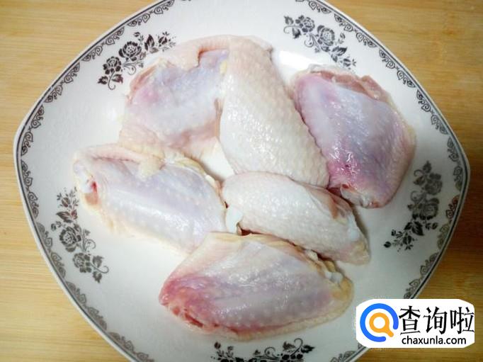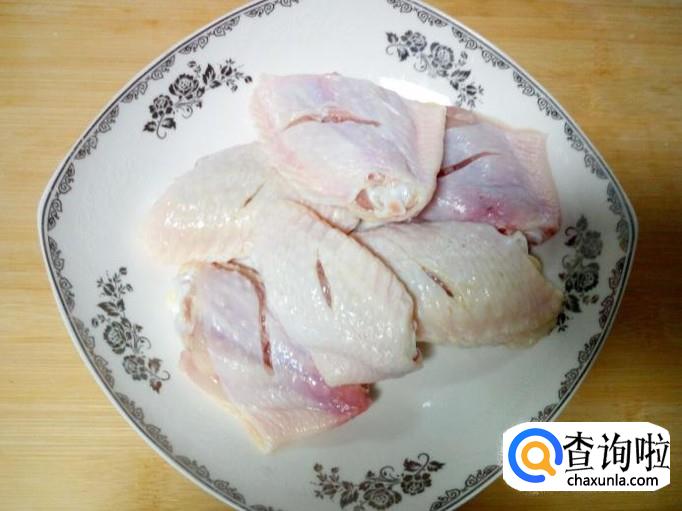 鸡翅用水清洗干净,控干水分。在鸡翅上划刀,便于入味。