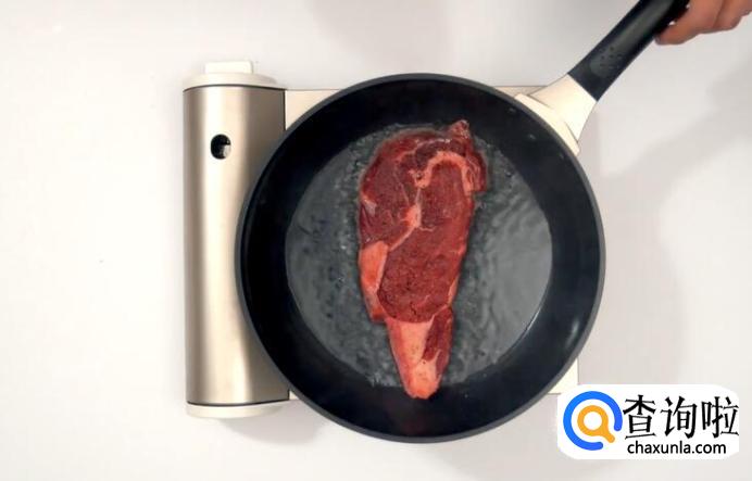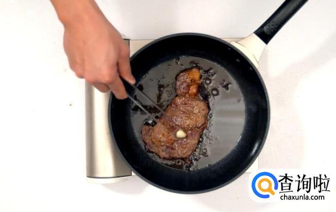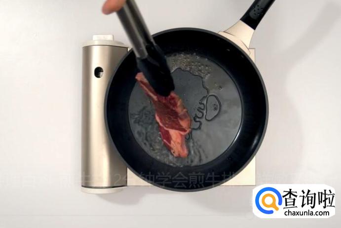 油冒烟时放入牛排,先大火煎30秒。