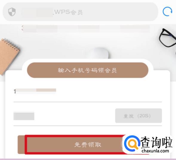 在这里输入手机号码再获取验证码,最后免费领取wps会员。