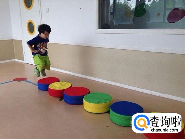 在我们进行孩子的前庭觉训练的时候,也可以给他们铺一些大一点的圆垫子让他们跳,但是一定要注意安全。