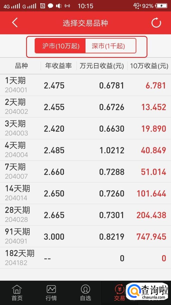 此时,我们就可以看到当前可以参与买卖的国债逆回购标的了,如图所示,国债逆回购是有门槛的,即沪市10万起购,深市1千起购。