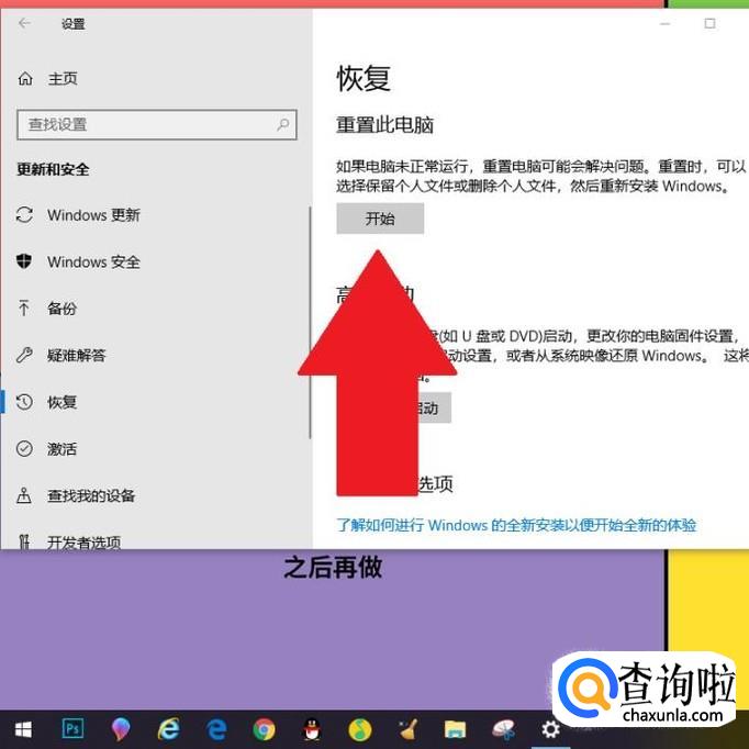 最后点击重置此电脑字样下方的“开始”按钮即可让电脑恢复出厂设置。