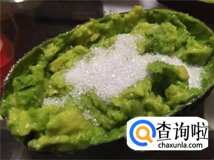 牛油果对半切开,把果核取出来,果肉上面撒一勺白糖,这样边吃边搅拌,又甜又好吃哦。