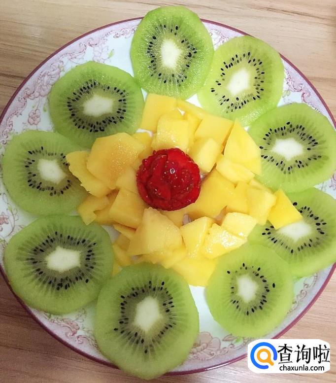 猕猴桃、苹果、草莓为材料。分别洗净待用,猕猴桃去皮切片,苹果削皮切块,一个草莓从上面横竖划几刀像个花朵,先放苹果块,在放中间的草莓,边上摆好猕猴桃片就好。