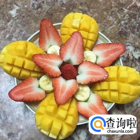 选用芒果、香蕉、草莓,这些材料分别洗净,香蕉切成中间切四块,不要太厚,四个草莓分别从中间切开,中间摆一个完整的草莓 然后四块香蕉,然后摆切开的草莓上下四半,两个小芒果,分别横刨下来,带皮贴手心放,在果肉上竖切两刀,横切3刀,抓着两边往上翻一些,果肉突出在表面,摆放盘中,两个芒果也就是刨成四块,如图摆好。