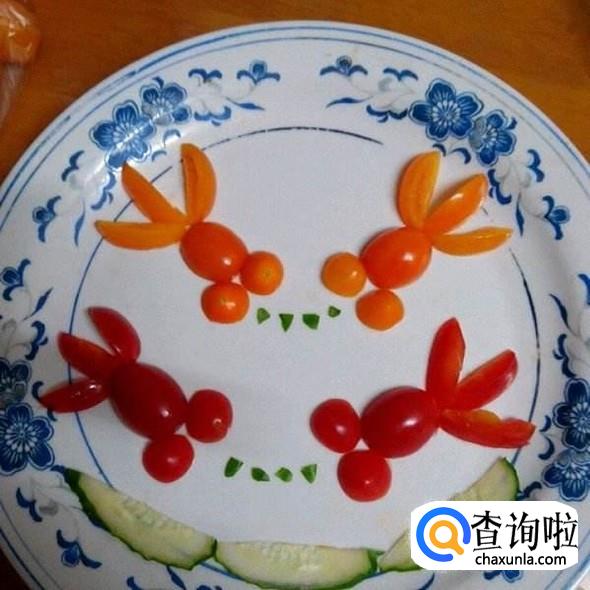 主要材料小西红柿,配黄瓜做点缀。西红柿黄瓜洗净待用,取两小西红柿当金鱼身子,西红柿横着放案板一刀横切两半,另一个横放竖切两头,用尖和把那边分别当眼睛摆放,最后再用横放横切两半,用半个西红柿从中间划切两刀,头上连着后面切开就是金鱼尾巴,如图摆放好。