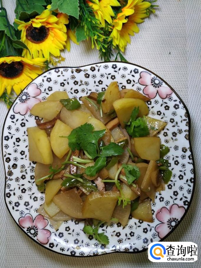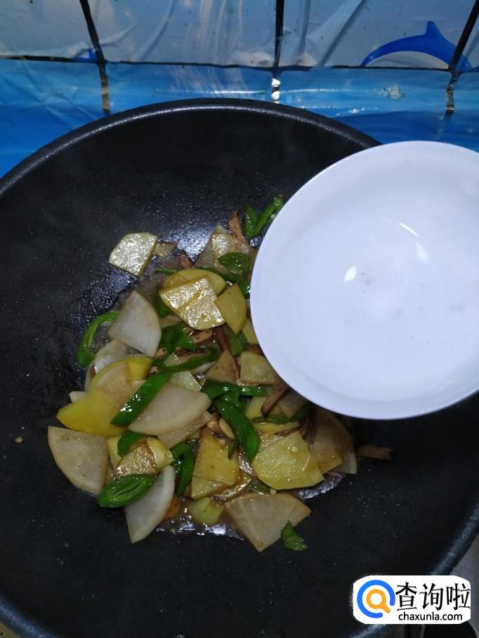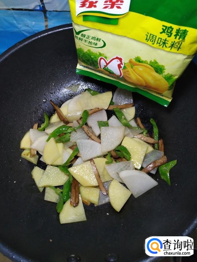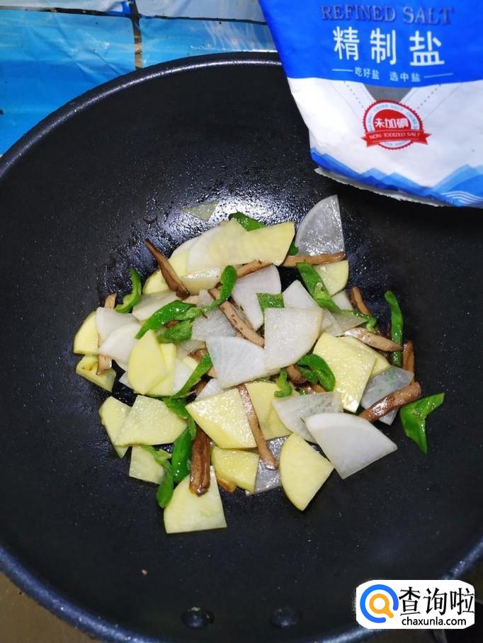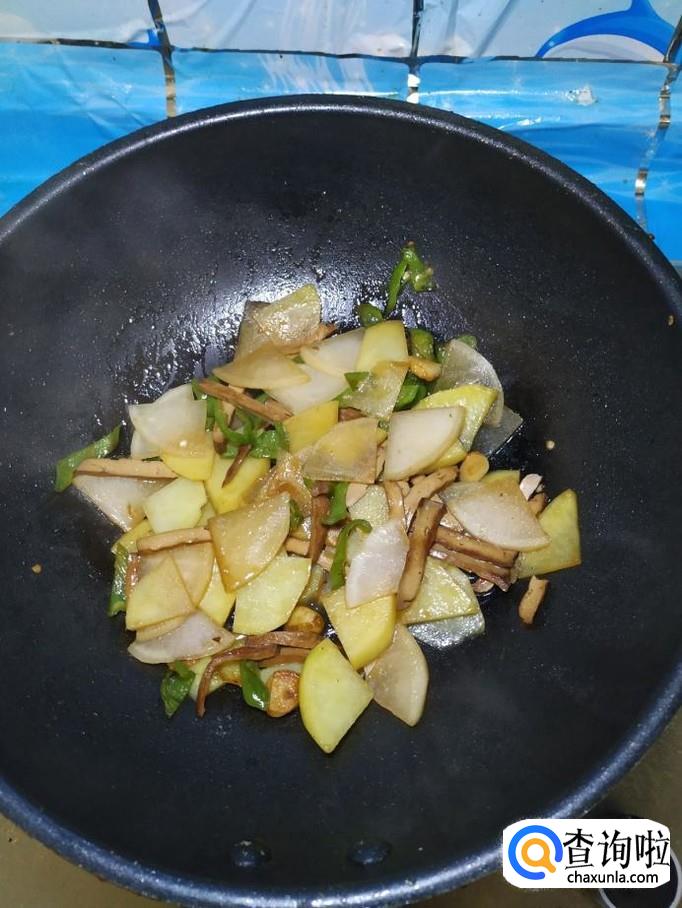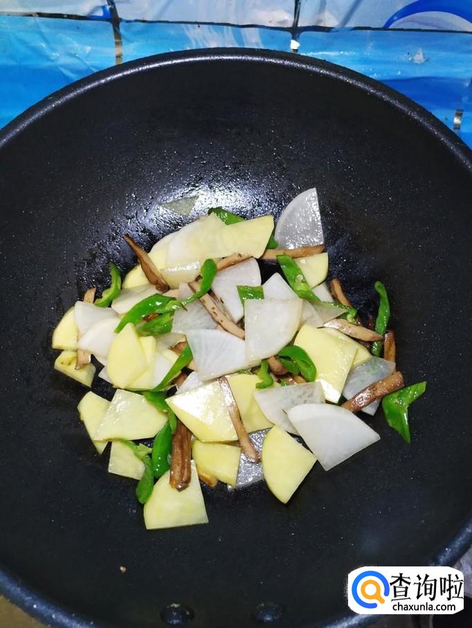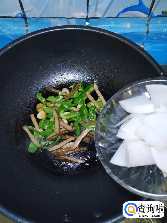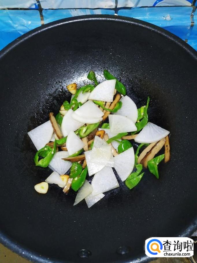 炒至青椒丝,豆干丝变软之后,将白萝卜片儿倒入锅中,翻炒均匀。