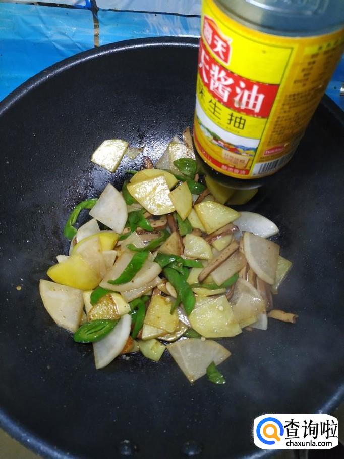 加入适量生抽,再加小半碗清水,盖上锅盖儿,大火将水烧开,转小火收汤汁。