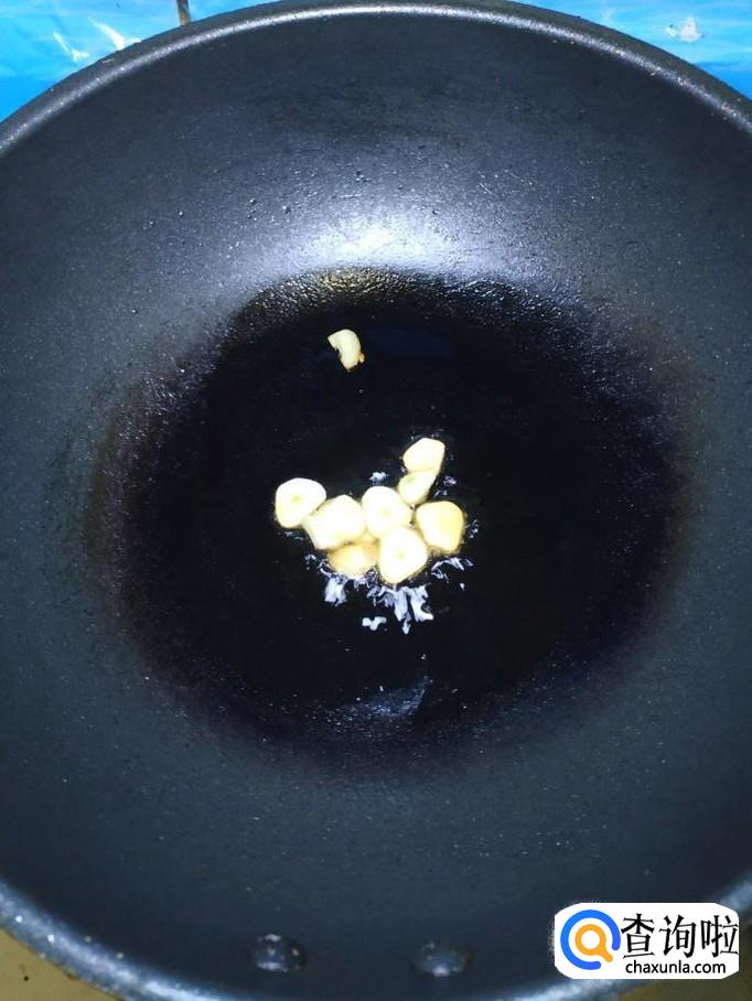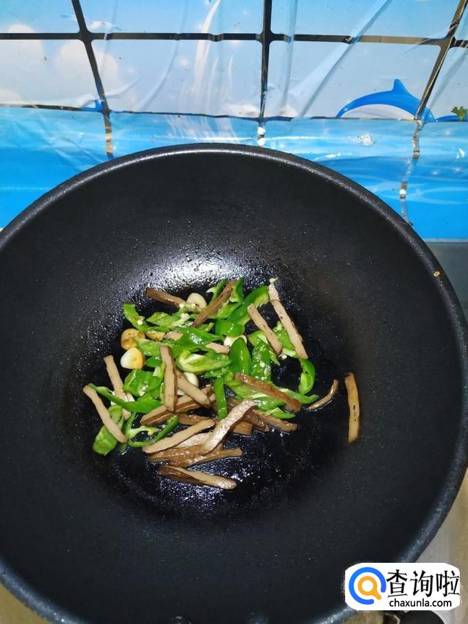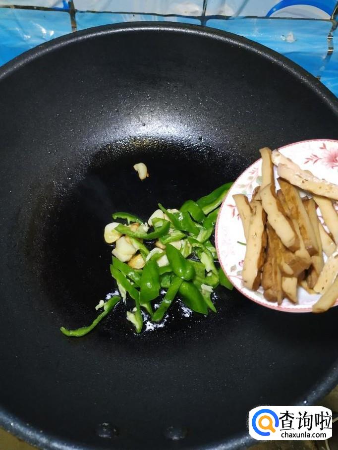 炒锅中放入适量油,油热后将蒜片放入锅中炒香,然后将青椒丝和豆干丝倒入锅中,翻炒均匀。