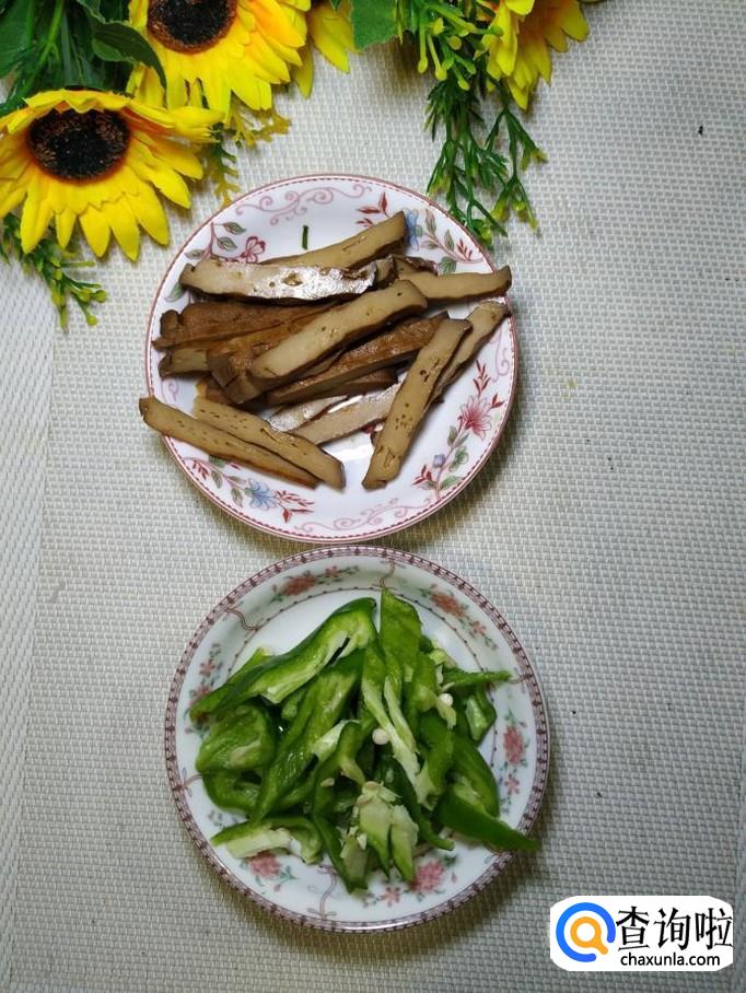 准备适量青椒和香干,洗净后切成丝,分别放入盘中备用。