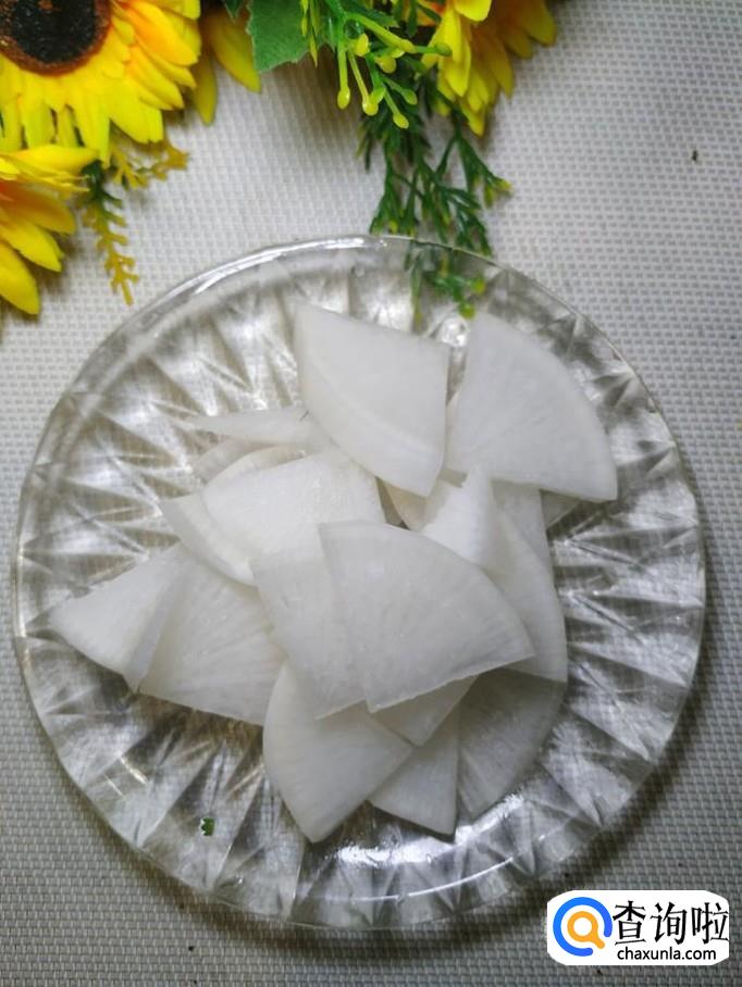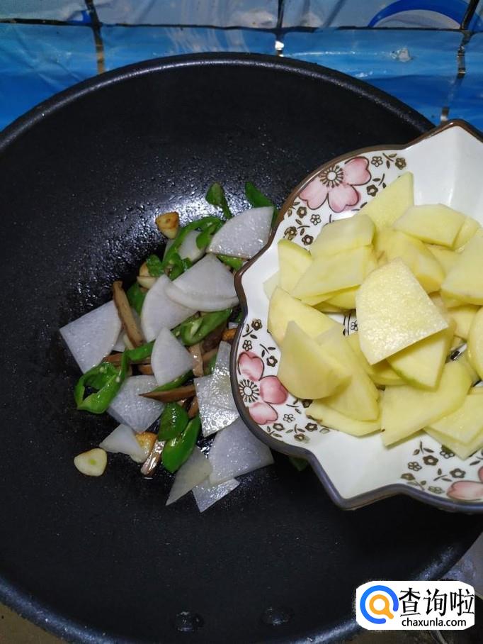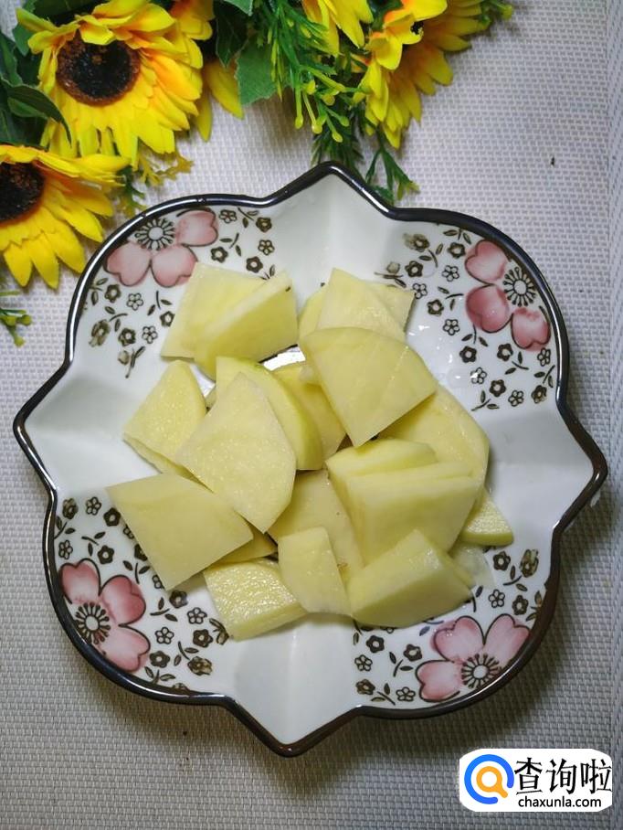 准备适量白萝卜和土豆,洗净后去皮,切成片。将土豆用清水冲一下,洗去淀粉备用。