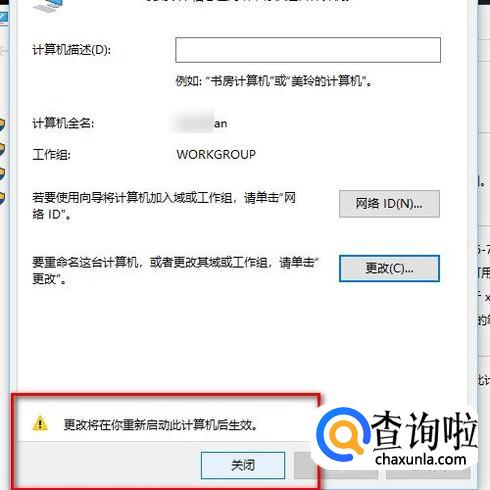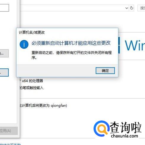 修改完计算机名后必须要重启电脑才能生效,点击上一步的“确认”按钮,此时会有重启电脑的提示框出现,点击“确认”按钮即可。