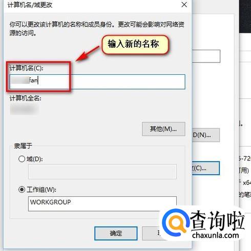在弹出的输入框中输入新的计算机名称,其他的使用默认设置即可,然后点击确定按钮即可。