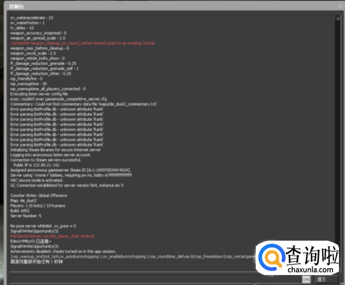 然后输入:mp_warmup_end;bot_kick;sv_autobunnyhopping 1;sv_enablebunnyhopping 1;mp_roundtime_defuse 60;mp_freezetime 0;mp_restartgame 1。