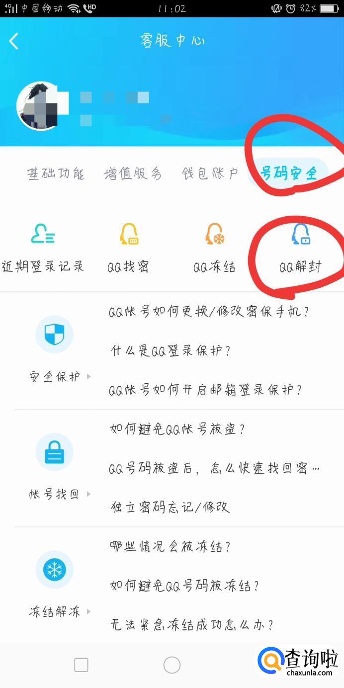 在“帮助”页面中,我们先在菜单框中选择“号码安全”,再在其页面下点击打开“QQ解封”。