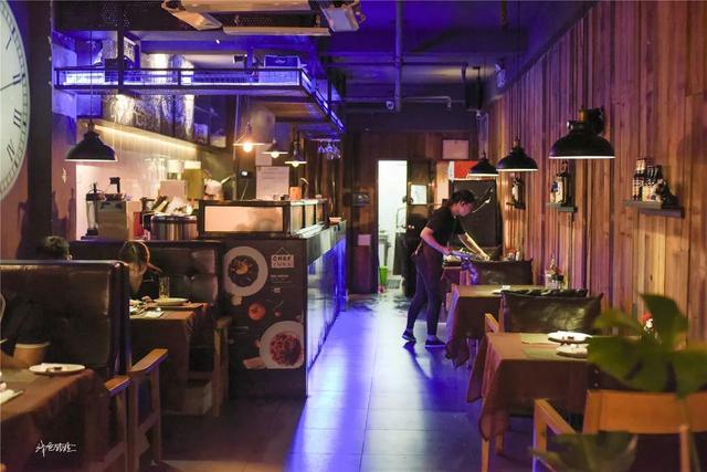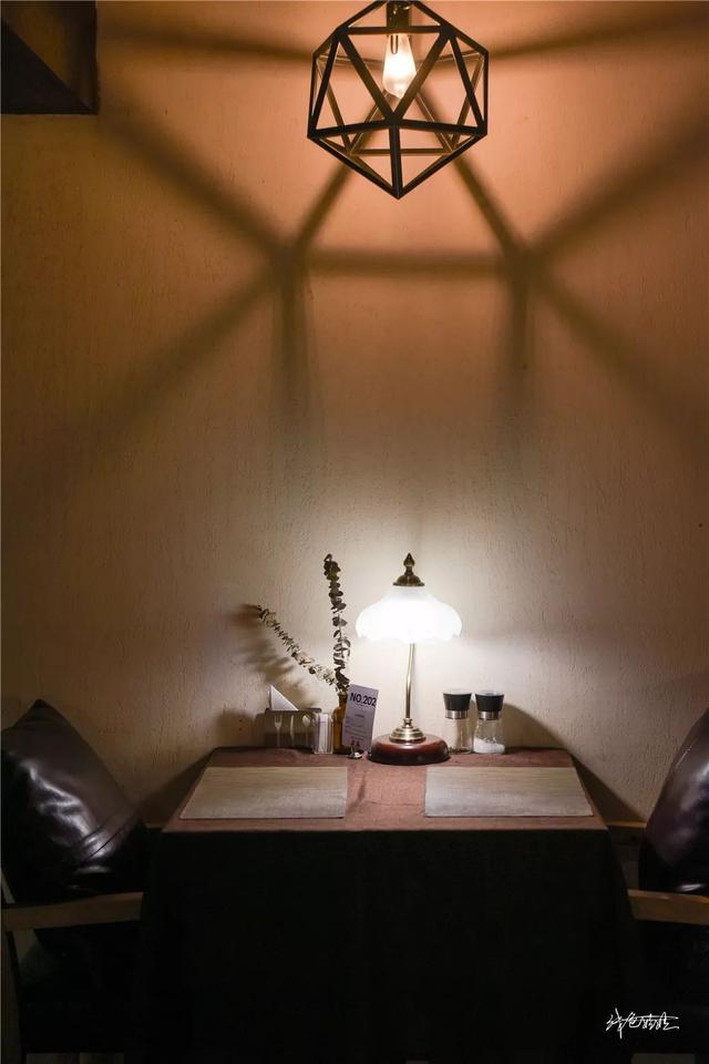 二楼更加私密,暧昧迷离的灯光仿若烛光,简约整洁的双人餐桌,昏黄的吊灯交织轮廓在白墙,炽白台灯照亮两人互动的区域,高背沙发犹如天然的屏障,巧妙的与隔壁桌间隔开来。而靠墙的位子更为独立的营造出浪漫的二人世界。约会,本就该在这样的地方。