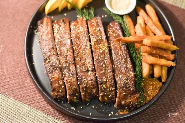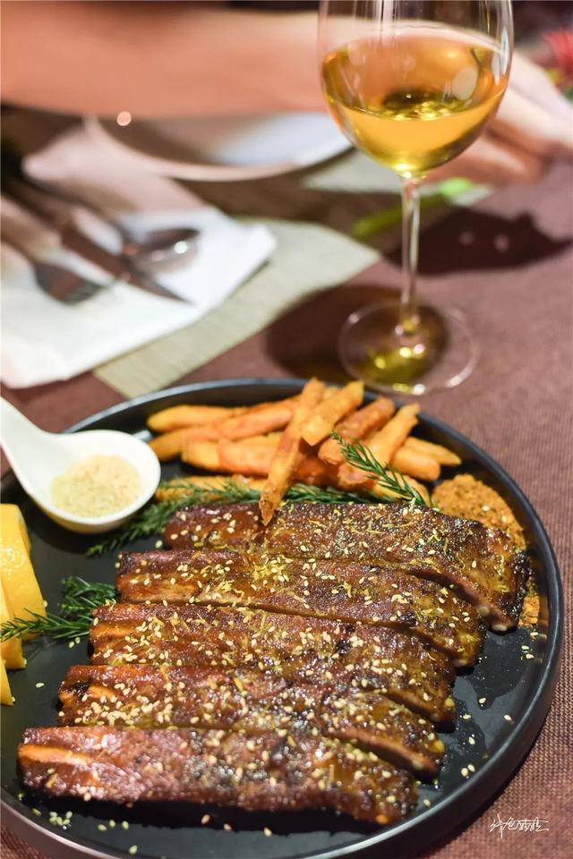 熏烤的猪肋排一上桌就香气四溢,令人垂涎三尺。猪肋排色泽油亮,外表焦脆,厚实的排骨肉十分有嚼劲,提前腌制入味的孜然咸香混搭蜜汁与香草,唇齿留香,一根还没吃完就想着下一根。脆甜可口的地瓜薯条比传统土豆薯条更加好味健康。