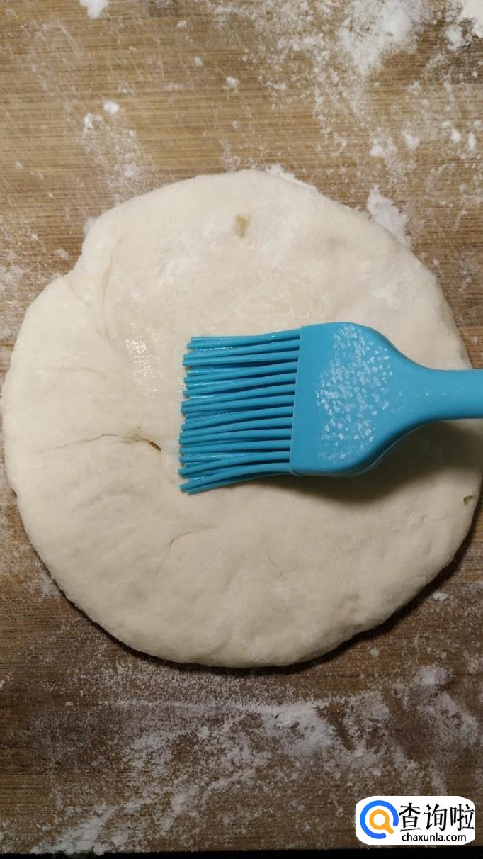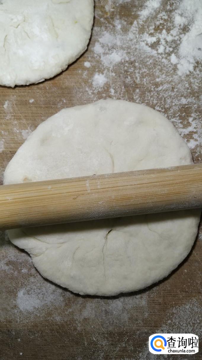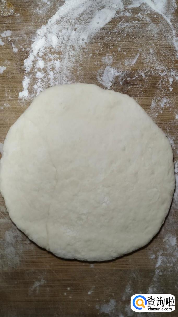 将醒发好的面团,用手揉均匀,然后分成小剂子,用擀面杖擀成薄的面片。
