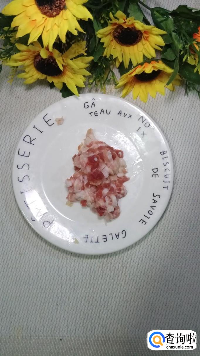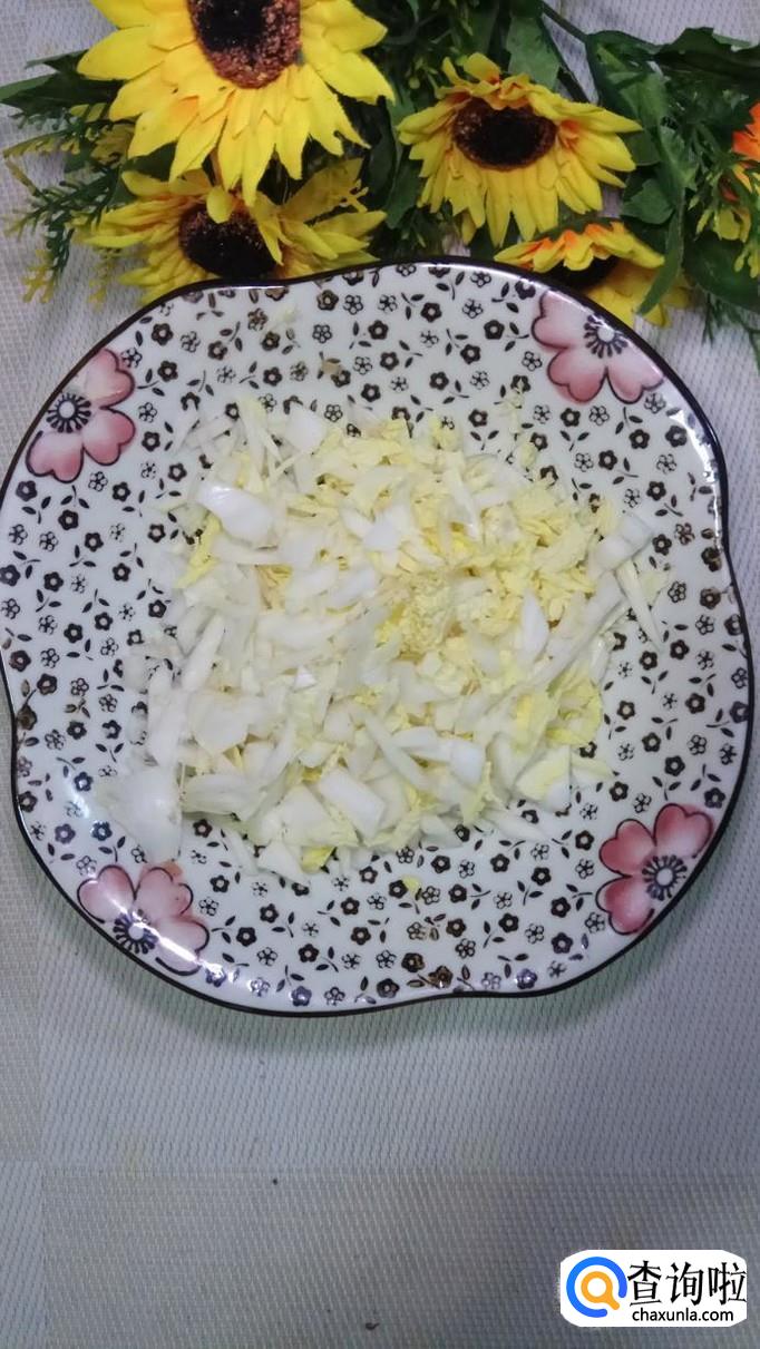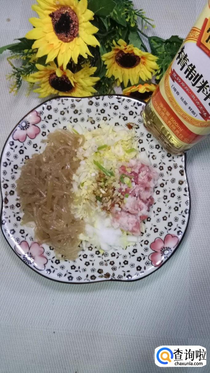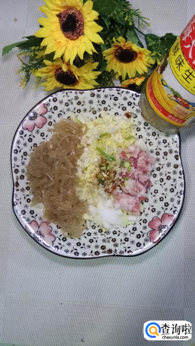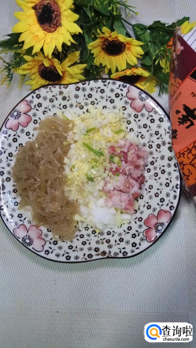 准备适量粉条,用清水泡发;再准备适量白菜,切成碎末;再准备适量五花肉,洗净后切碎。