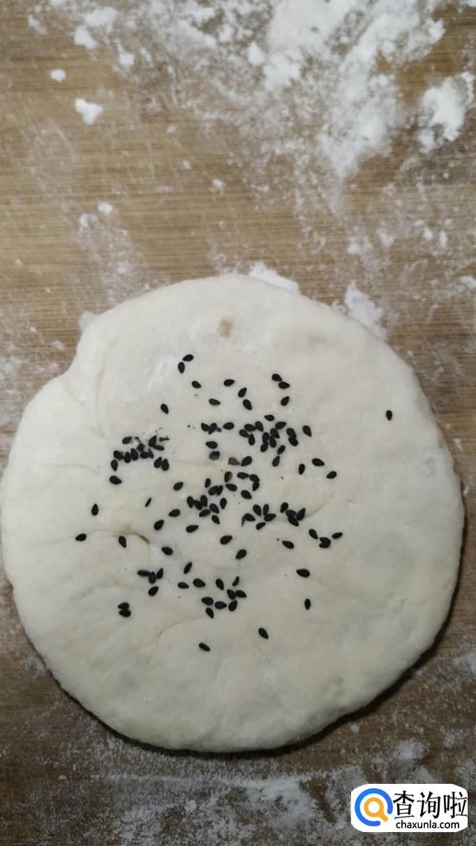 按扁之后,用擀面杖擀成圆形,上面刷少许清水,粘上黑芝麻。
