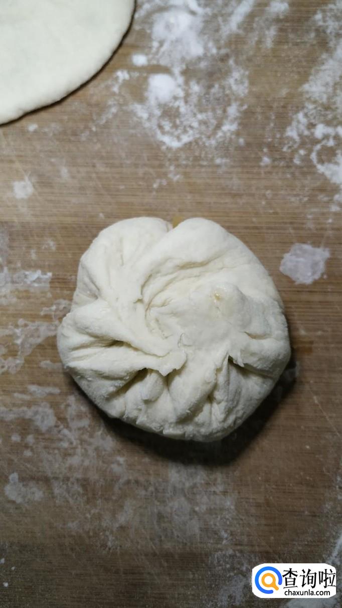 将做好的馅放在面皮上面,用手捏成包子的形状,再用手按压一下。