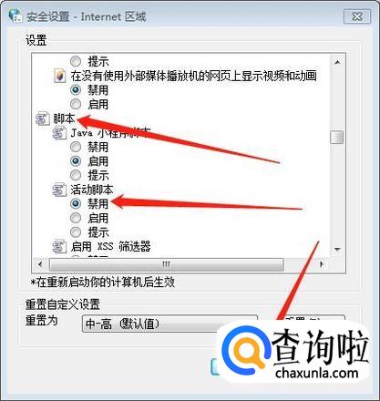 然后我们找到“js脚本”的栏目,勾选禁止“活动脚本”然后点击确认。