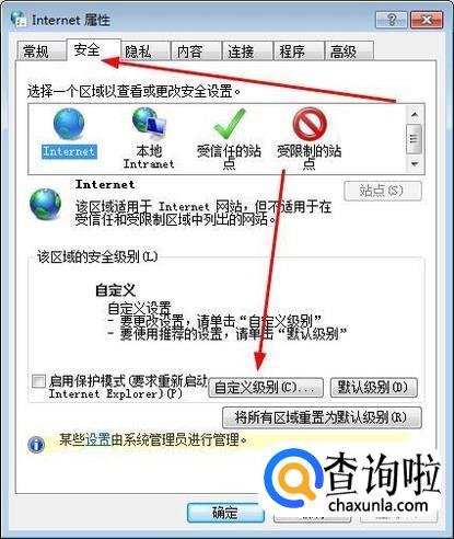 进入Internet属性窗口后我们点击“安全”窗口,选择“自定义级别”进入。