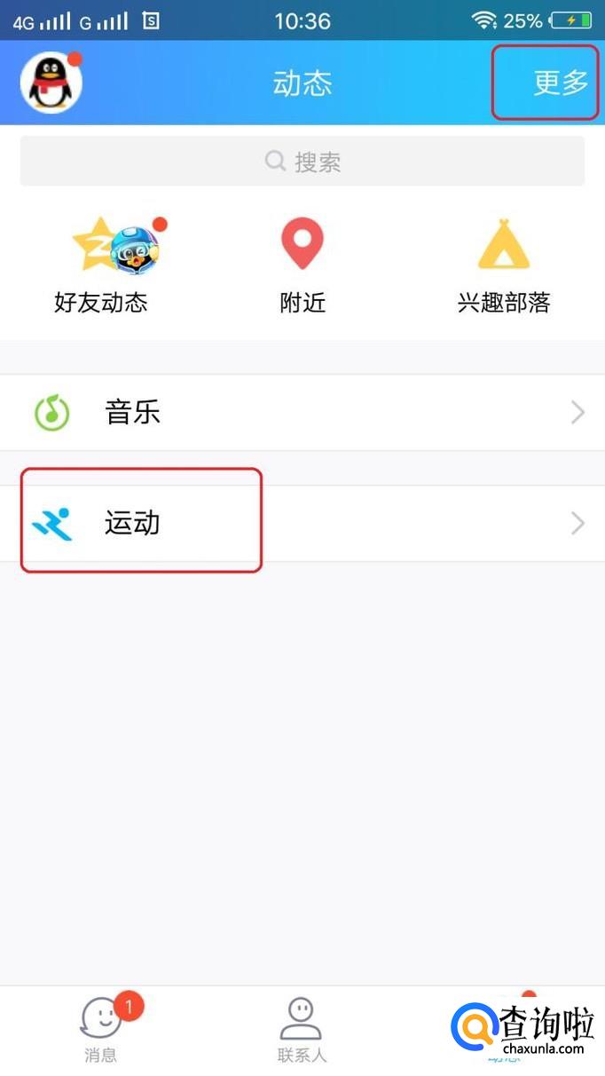 然后,在动态页面内点击“运动”,如果没有“运动”选项,就点击右上角“更多”,找到运动并添加。