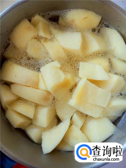 锅子清洗干净,把苹果块放进去,加上适当清水用大火煮开,小火慢慢的煮。
