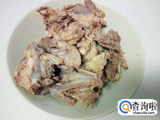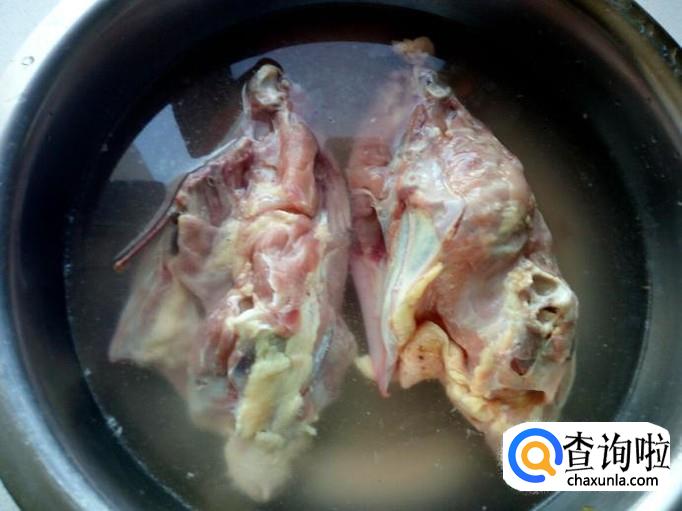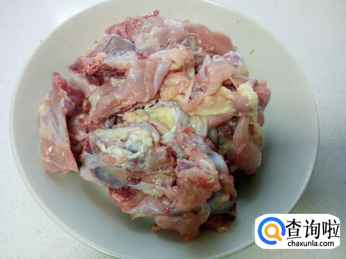 把买回来的鸡架放入水中,浸泡半个小时,去除上面的血水。然后用水冲洗干净,控干水分,去掉上面的黄油,鸡尖,用刀剁成块。