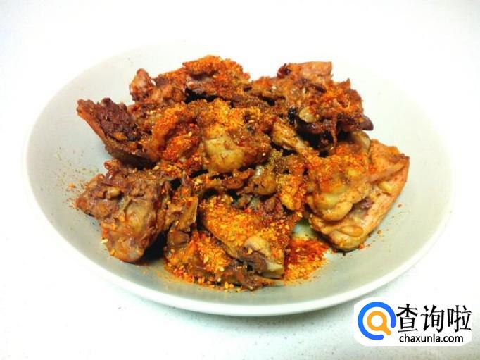 把炒好的鸡架控油,装入盘中,撒上烧烤料即可。