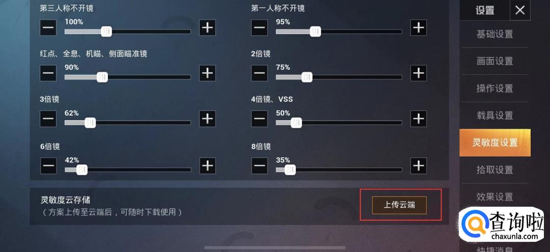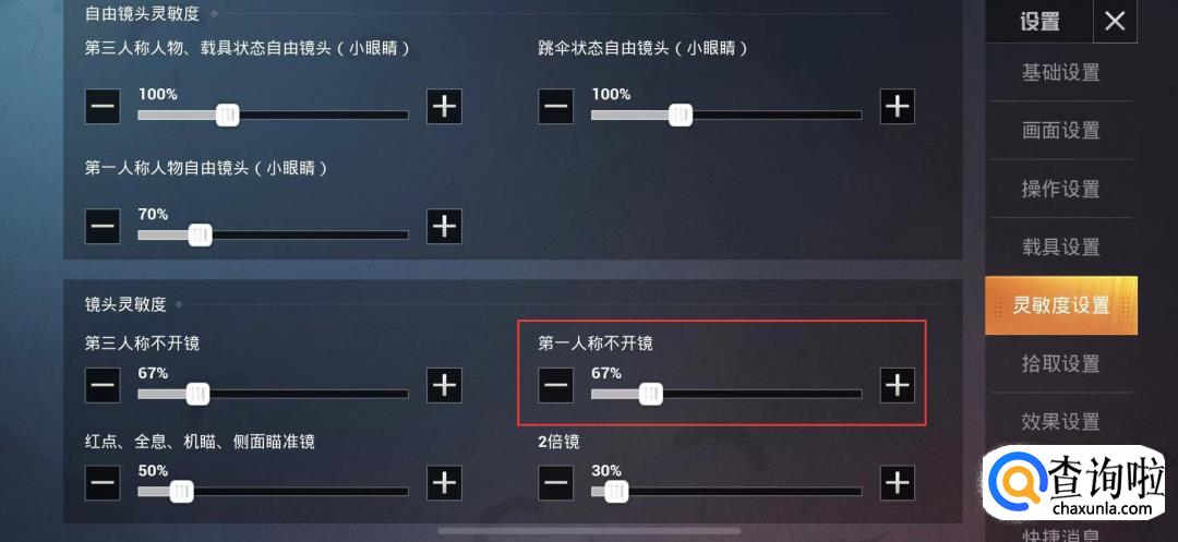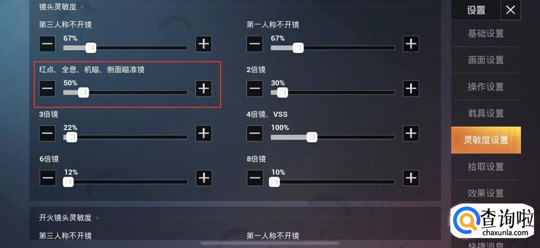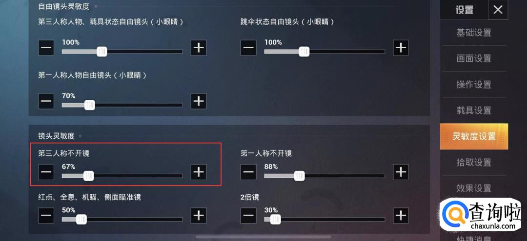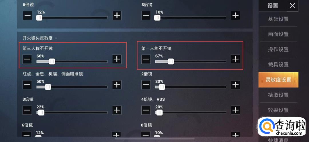 在“开火镜头灵敏度”中将“第三人称不开镜”调至“66%”,第一人称调到“67%”。