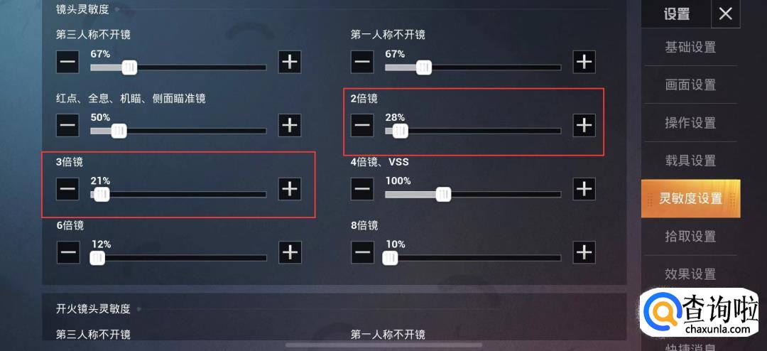 2倍镜调至“28%”,3倍镜调到“21%”。