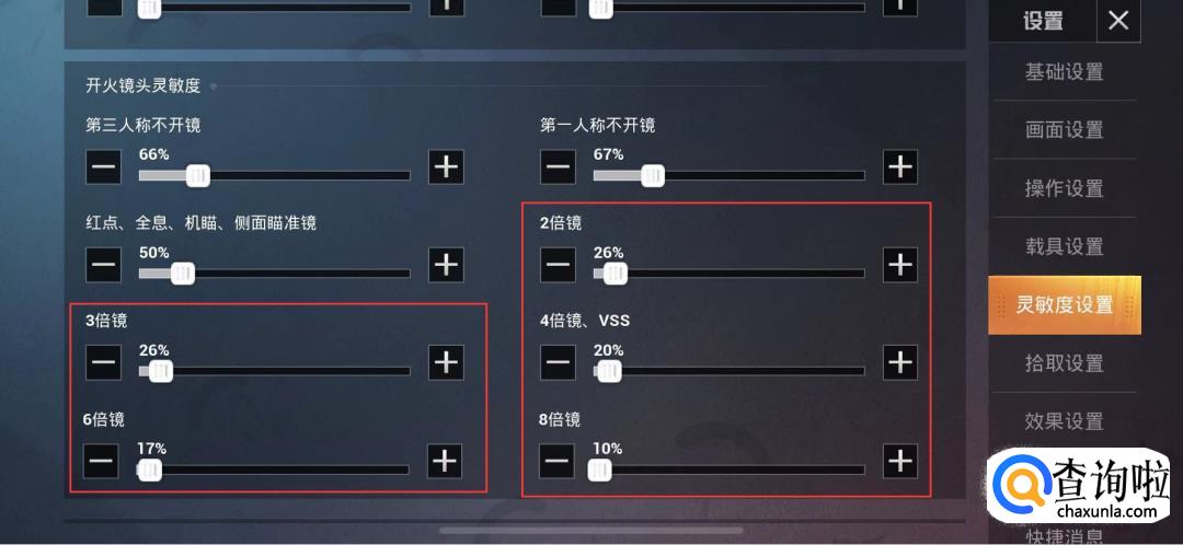 2倍镜调至“26%”,3倍镜调到“26%”,4倍镜调至“20%”,6倍镜调到“17%”,8倍镜保持在默认的“10%”。