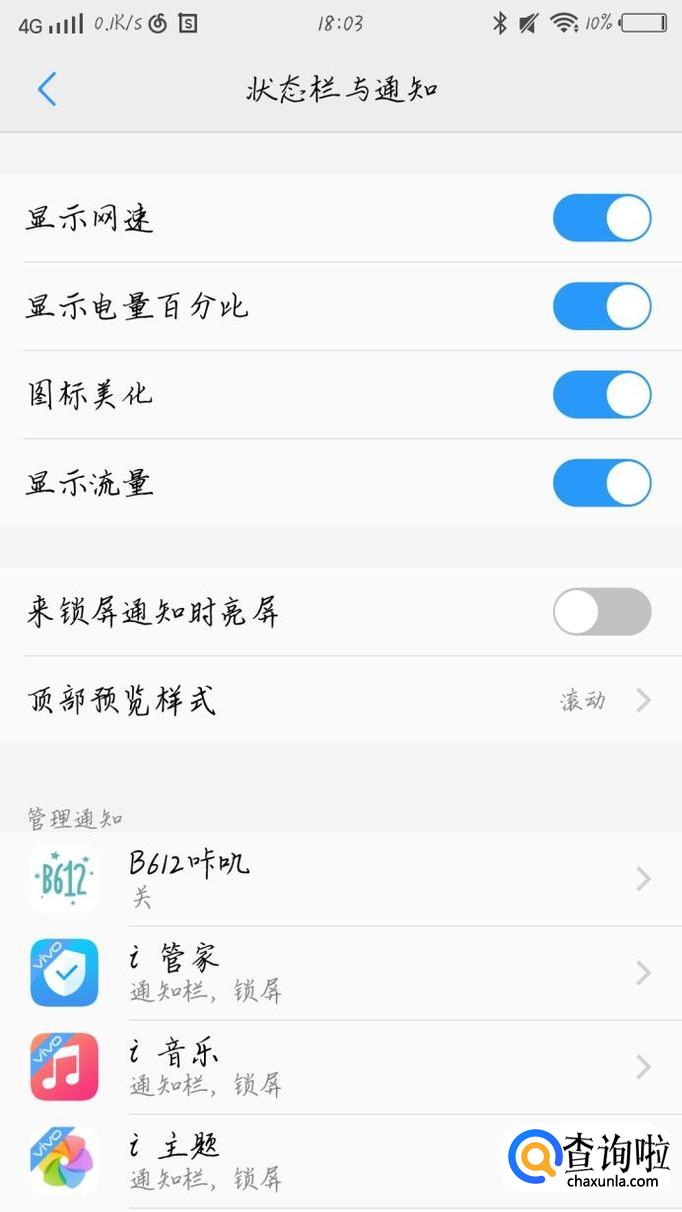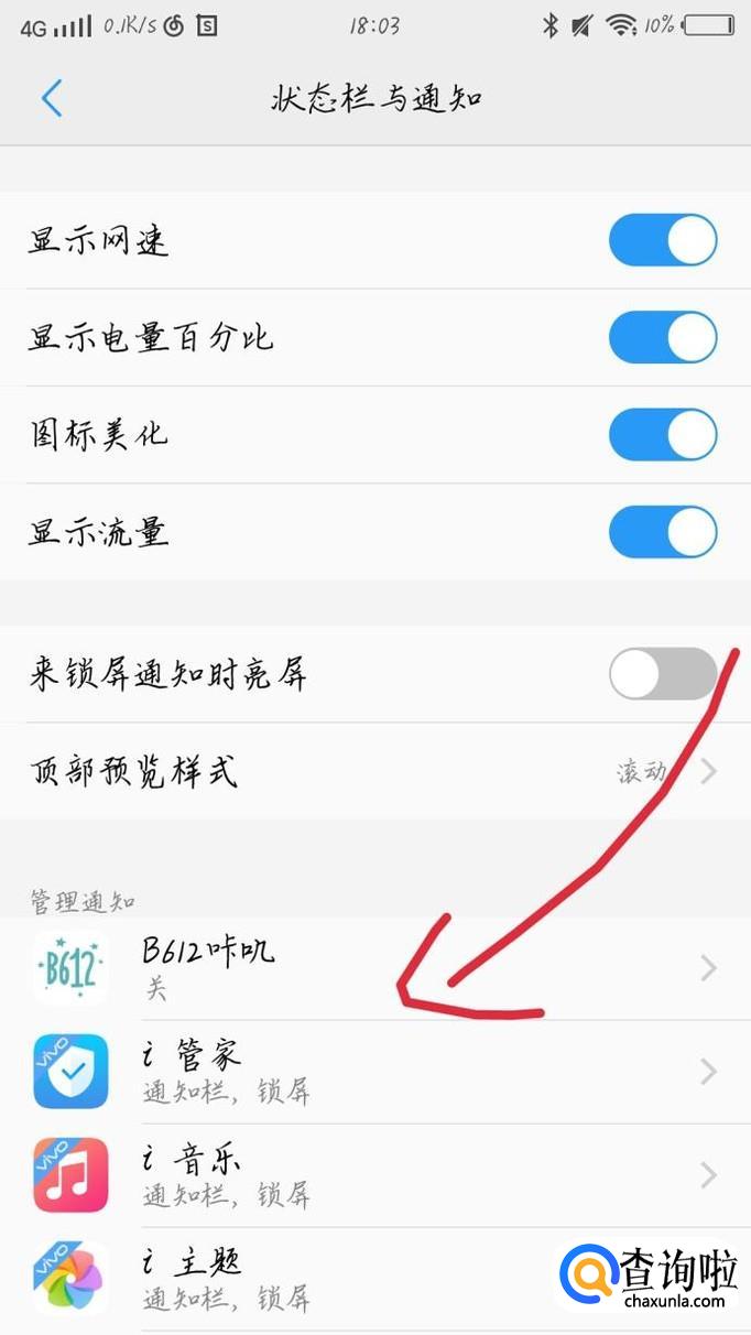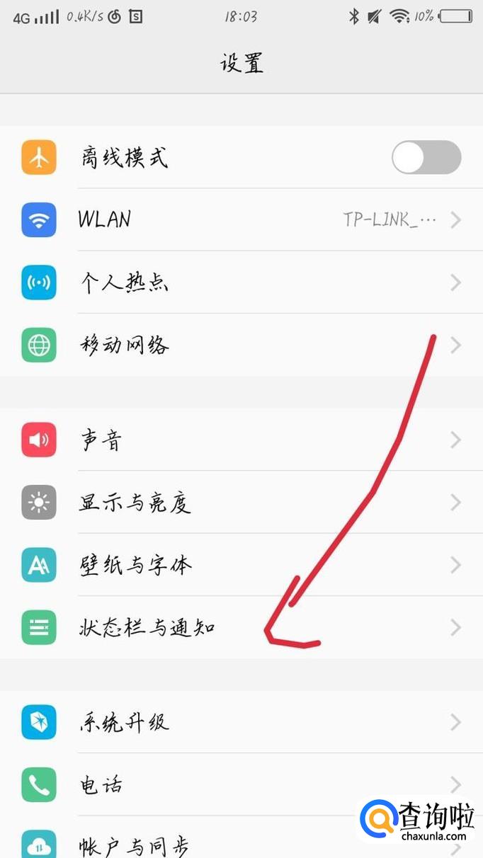 向下滑动手机,点击“状态栏与通知”选项,如图1箭头所示。你会看到出现一个新的界面,如图2所示。