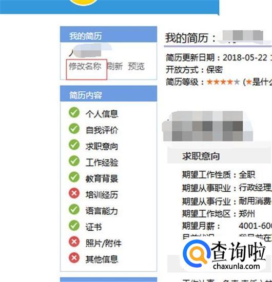 点击修改名称,进行修改简历名称,见下图